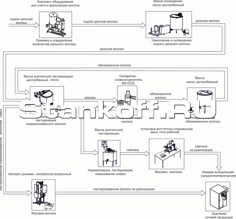Данное оборудование предназначено для производства молока пастеризованного нормализованного и сметаны, упаковки молока в полиэтиленовые пакеты, упаковки сметаны в стаканчики из полистирола.
