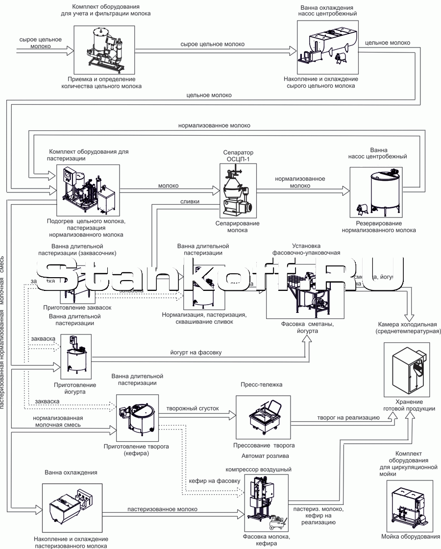 Данное оборудование предназначено для производства молока пастеризованного нормализованного и сметаны, упаковки молока в полиэтиленовые пакеты, упаковки сметаны в стаканчики из полистирола, так же производства творога полужирного (9%), кефира(3,2%), йогурта (4%).