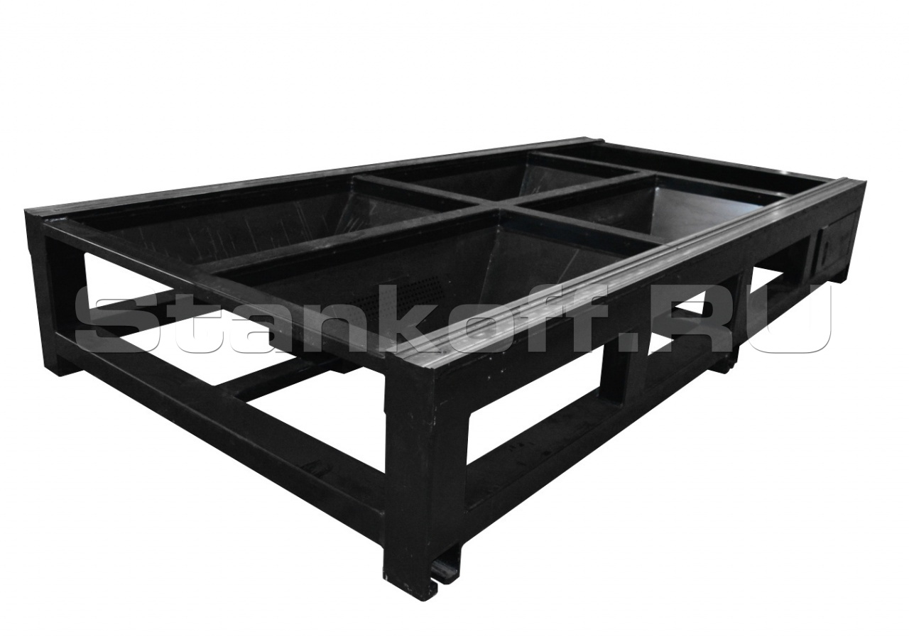 Станина сварена из высококачественных труб прямоугольного сечения и снабжена дополнительным утяжелением. Для повышения точности и надежности станина станка прошла термический отпуск и была фрезерована и калибрована. Высокая прочность, устойчивость станины, обеспечивающие 20 лет работы без перекосов и деформации.Сменный стол